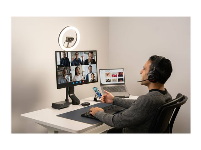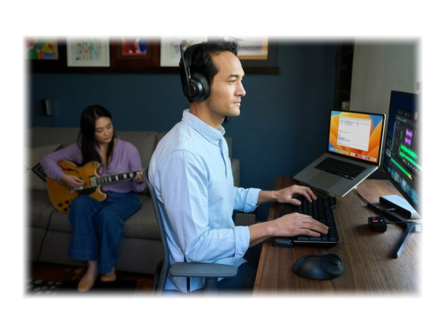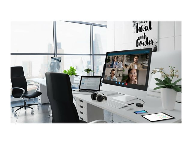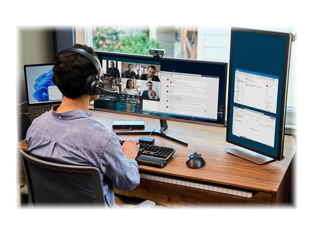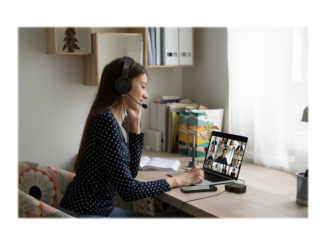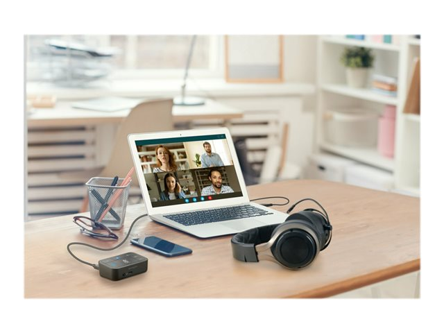 Les professionnels travaillant au bureau, à domicile ou en déplacement ont fréquemment besoin de passer d'une source audio à une autre depuis leur ordinateur portable, leur téléphone ou d'autres appareils. Qu'il s'agisse de répondre à un appel vidéo, de passer un appel téléphonique ou d'écouter de la musique, le basculement entre différents appareils peut être long et complexe. Notre switch audio 3 en 1 permet aux professionnels d'utiliser un même casque filaire ou sans fil tout en basculant entre trois sources audio différentes. Les utilisateurs peuvent facilement basculer entre leur ordinateur portable, leur téléphone ou leur tablette, ce qui leur permet d'augmenter leur productivité. Compatible avec de nombreuses plateformes, telles que Microsoft Teams, Google Meet, Zoom et WebEx, le switch audio 3 en 1 professionnel pour casques offre une expérience audio professionnelle grâce à ses boutons de commande pratiques permettant la commutation des appareils, le contrôle du volume et la désactivation du son.