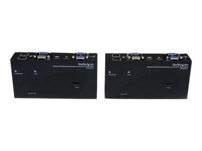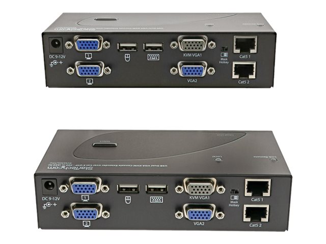 L'extendeur KVM double VGA sur Cat5 prend en charge les boutons poussoirs et les raccourcis clavier d'utilisation facile, qui vous permettent de permuter entre les systèmes connectés localement et à distance, alors que les branchements de console aux deux extrémités de votre configuration offrent un accès facile à tous les systèmes connectés aux deux endroits. Les raccourcis clavier permettent également de régler la vidéo pour optimiser la qualité de l'image sur diverses distances. L'extension sur deux câbles standard Cat5 (ou plus) vous permet d'utiliser le câblage existant afin d'assurer l'accès à distance à votre serveur ou à votre commutateur KVM.